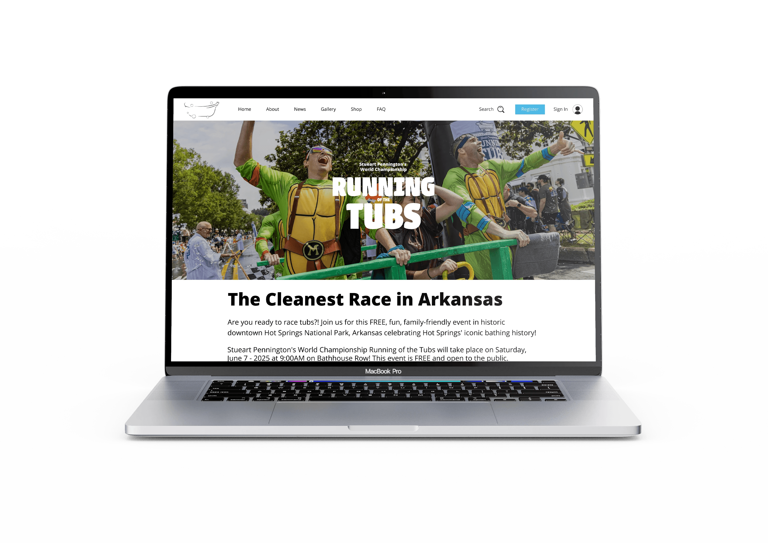 The Stueart Pennington's World Championship Running of the Tubs is a yearly race in Hot Springs National Park, Arkansas. Participants decorate and customize bathtubs while working in teams to get their tub to the end of the track the fastest in order to become champions. There are also awards for different categories of tubs as well as the decorations each team applies. For this project, the design objectives were to redesign a brand identity and visual system, apply that system to various formats, communicate the event information clearly to the target audience, and organize information into a clear and recognizable hierarchy.